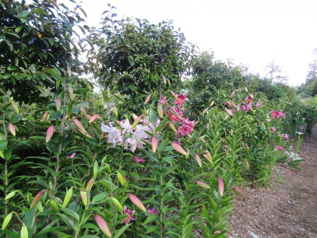 We grow a lot of Aurelians and auratum lilies and they are a strong feature of our summer gardens. But neither of us were at all sure what the definition of an Oriental lily was. It turns out that Oriental is a broad term that takes in a whole lot of hybrids between different species but the dominant genes come from Japanese lilies. They flower a little later in the season and they usually have the best fragrance. L. auratum that Mark and his father before him have done quite a bit of work on to get a range of good garden plants here would be classified as falling within the Oriental group even though they are just variations on the one species.