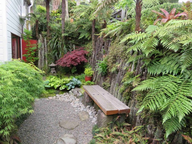 Three Elms is a town garden on a section that is not large but started out as a steep challenge. It is a due to their hard work and thoughtfulness that the gradient is no longer a problem. They have created small terraces with fairly easy transitions between them, belying the original slope and making moving around the area straightforward. Talk to Shane, if you visit, about the lengths he had to go to installing the large boulders and rocks that are used extensively. They are a feat of determination and physical effort.