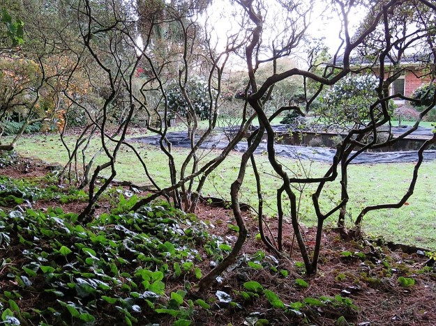 The gnarly trunks of the aged Kurume azaleas. In the background, Mark has draped old shade cloth over the newly sown areas of grass to discourage the pesky rabbits and sparrows.