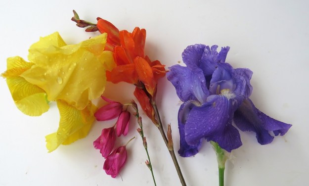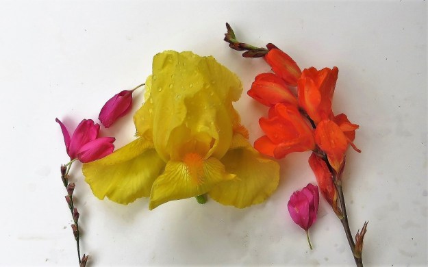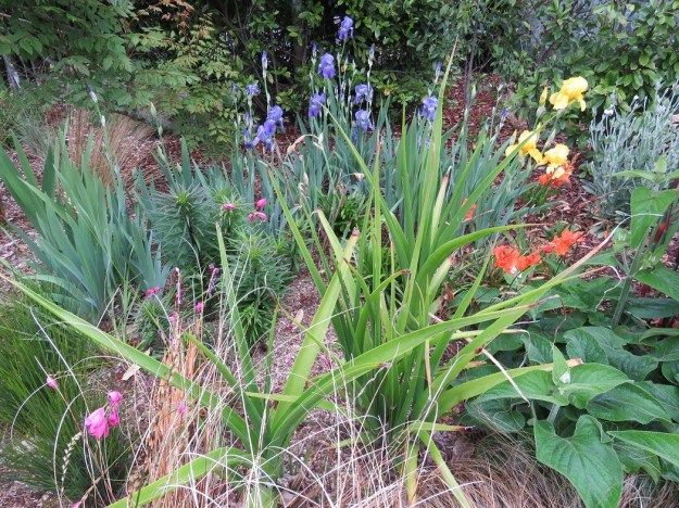I was slightly alarmed by an inadvertent colour combination in my new borders. I picked a flower of each to show the colours more clearly. I am pretty sure I thought the bearded irises were all yellow when I planted them but 80% are purple. While the colour is sparse in these early stages of planting, I am thinking ahead to when each forms a large wodge of colour.
