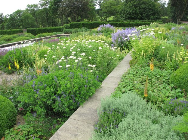 Just by way of illustrating the difference between immersive and pictorial gardens, look at these two side by side. It was the fully planted parterre that drew us in and made us catch our breaths in delight. Immediately adjacent to that, also in front of the house and looking out to the view was a more conventional lawn flanked by twin borders. Same designer, same location – two very different experiences. While admiring the horticultural excellence of the latter, it didn’t draw me in and make me want to linger as the more detailed and planted parterre did.