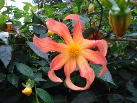 They are not called tree dahlias because they grow up like a tree but rather because they grow much larger than the usual type of perennial dahlias. In windy conditions they need a bit of support – some of ours we fence in with heavy duty bamboo cross bars. Otherwise, they are like any other dahlia with typical hollow stems and dahlia leaves, growing in a large clump from tubers below ground. Most tree dahlias come from D. imperialis which is native to Columbia and Guatemala which explains why they are not keen on cold and frosty conditions.