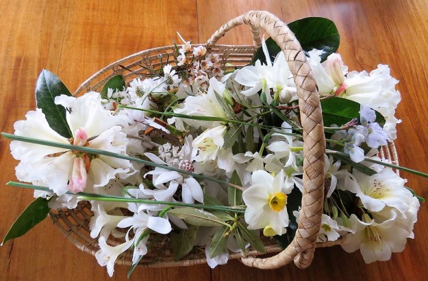 I have been drafting a piece about contemporary white gardens for a publication, so my mind has been on white blooms. Yesterday, in the post-election hiatus and the gloom of a wet, grey day, I headed round the garden with my vintage flower basket to pick a selection of white and largely white flowers.