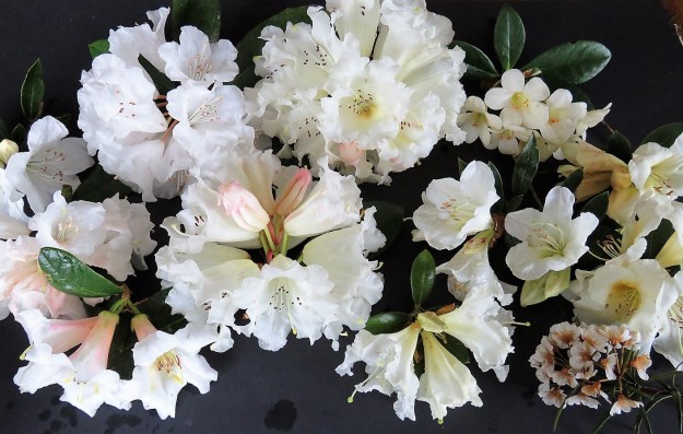 Are green flowers permissible? If so, why not the white Moraea villosa with blue peacock eye markings or Lachenalia contaminata or Onixotis triquetra which are white with maroon markings? If the latter two are not acceptable, does that rule out the white rhododendron with maroon spotting. Is it not sufficiently pure? Is it okay for a white rhododendron to open from a soft pink bud? No? How about a soft lemon bud or one with a green cast?