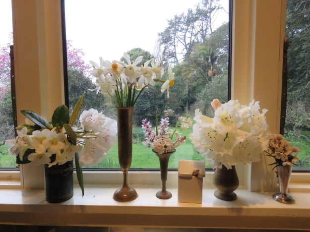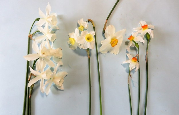 Is Narcissus ‘Thalia’ (on the left) acceptable in a white garden, though it is cream, not white? If ‘Thalia’ is acceptable, how about the narcissus with the pale lemon corona and white petals? And if that lemon corona is still okay, does this go across to ‘Beryl’ and other poeticus hybrids with white petals and small coronas which are somewhat stronger coloured and into the yellows and oranges? Where is the cut-off point? I tell you, this white garden business is fraught with problems and judgement calls.